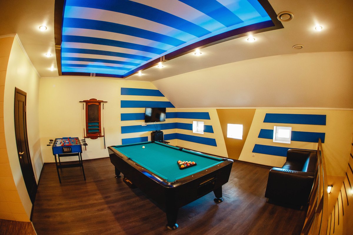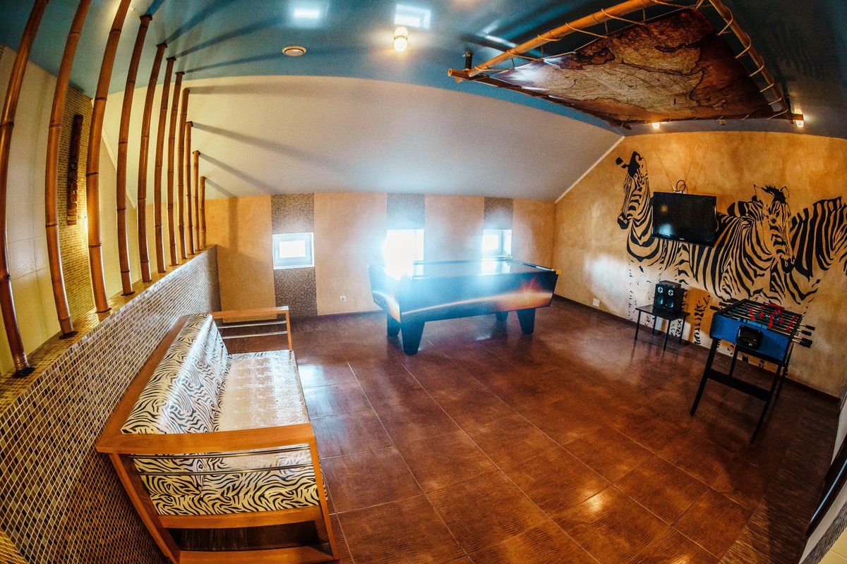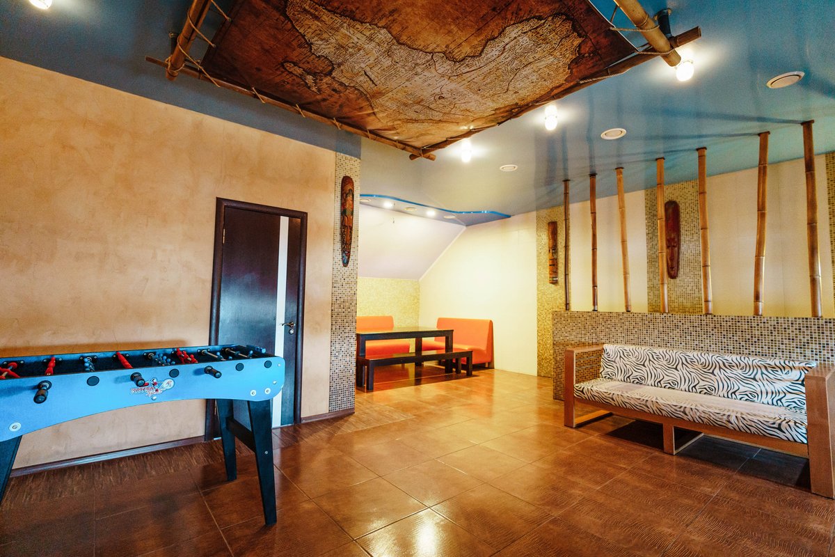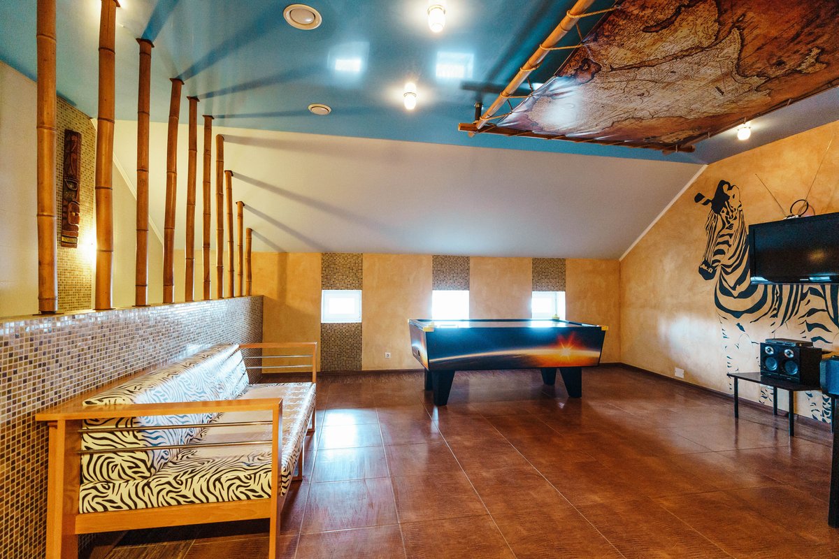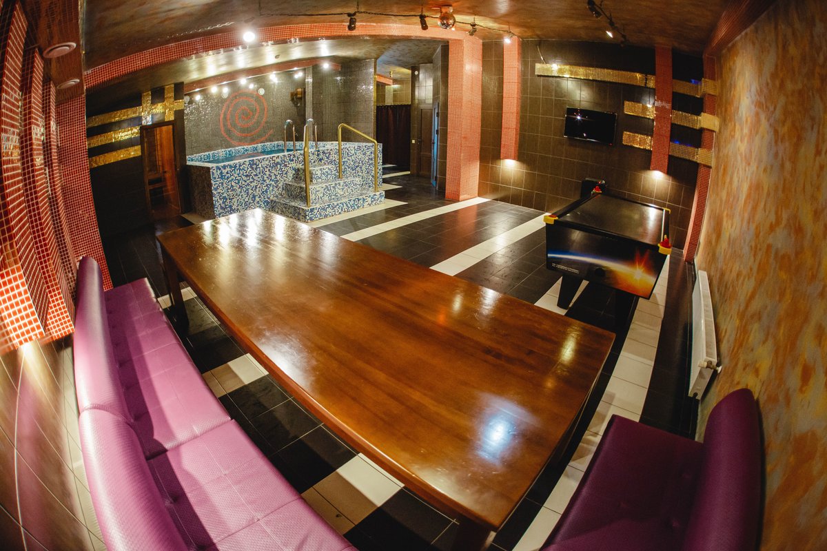Не хочется в бассейн? Не проблема! Вместо этого можно передохнуть в нашей комнате отдыха. Мы постарались создать здесь комфортный, стильный интерьер из максимально натуральных, экологичных материалов, выбрать мебель, которая будет одновременно удобной и эстетичной. Надеемся, что вам понравится! Для создания настроения у нас есть бильярд и караоке. Также у нас работает бар.