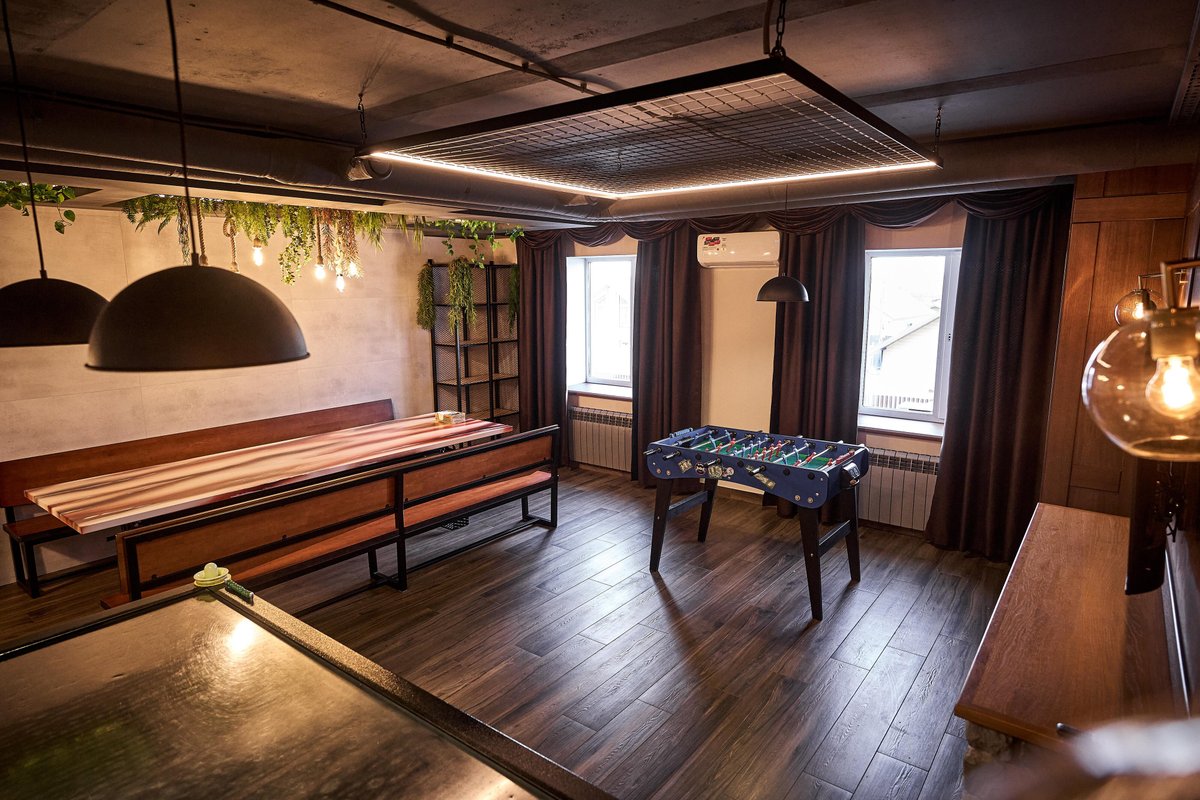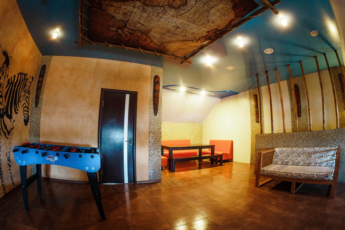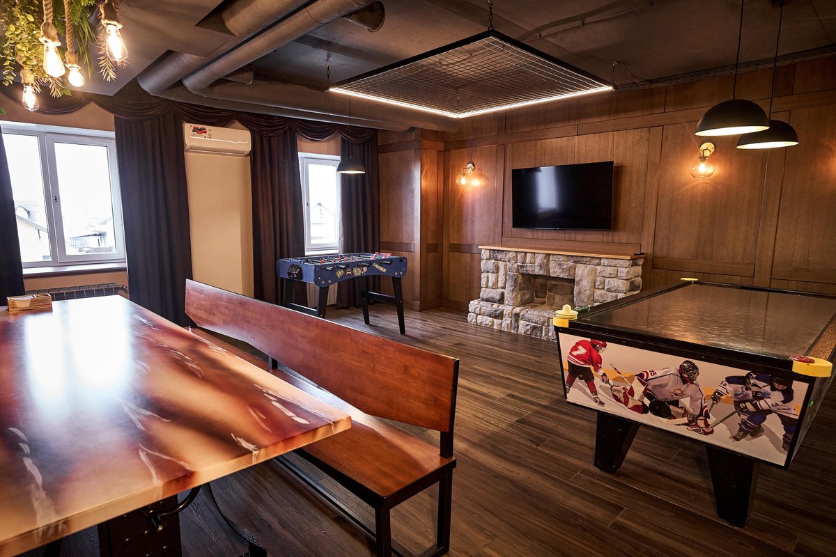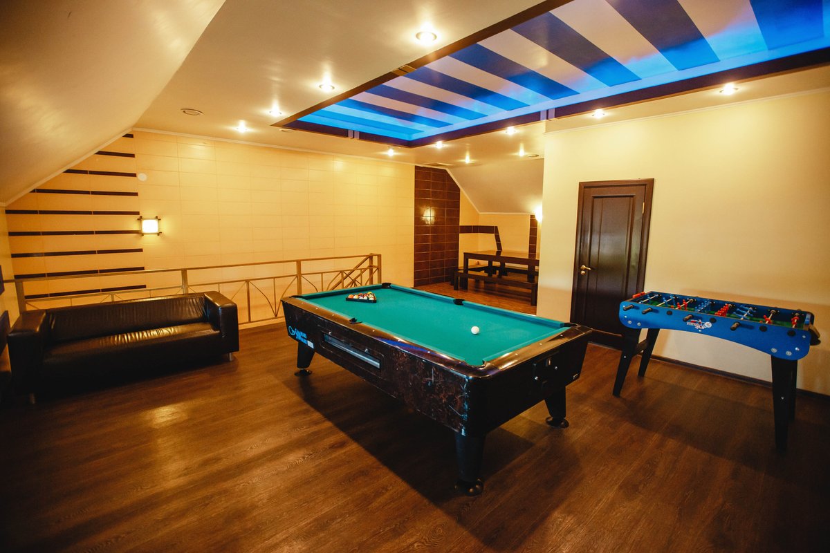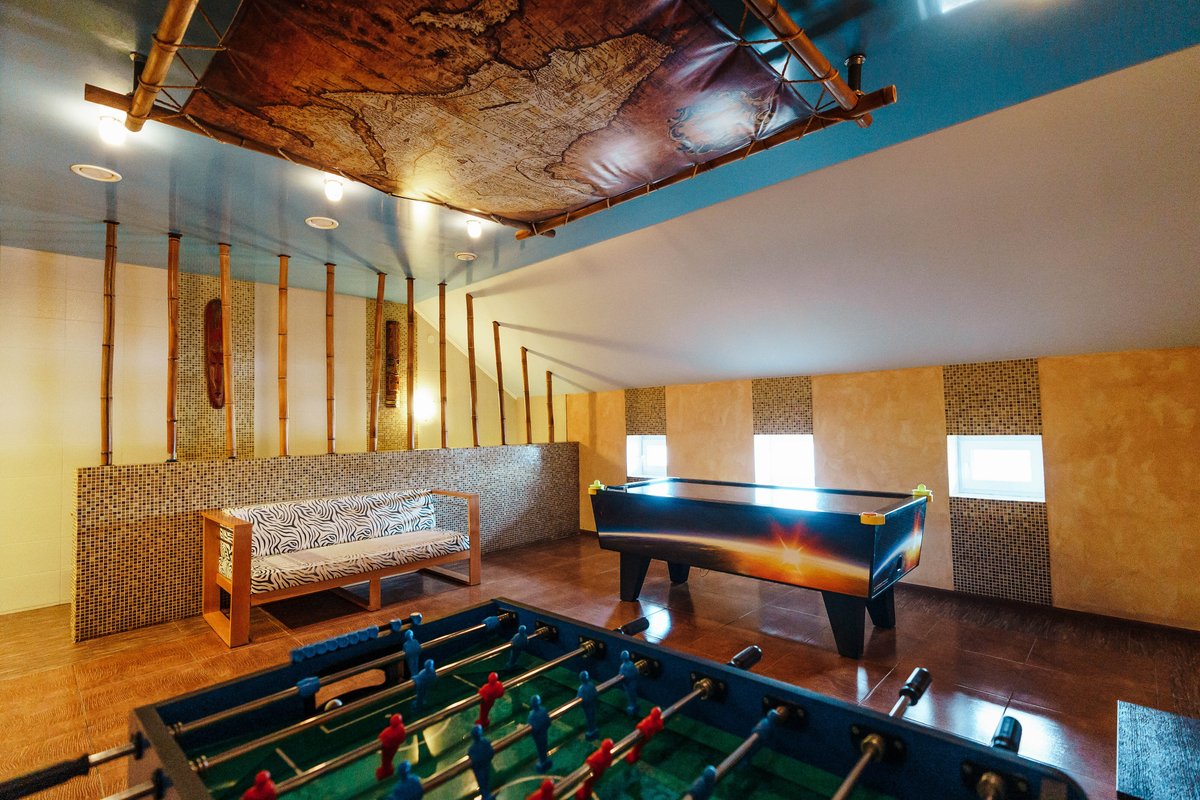 Не хочется в бассейн? Не проблема! Вместо этого можно передохнуть в нашей комнате отдыха. Мы постарались создать здесь комфортный, стильный интерьер из максимально натуральных, экологичных материалов, выбрать мебель, которая будет одновременно удобной и эстетичной. Надеемся, что вам понравится! Для создания настроения у нас есть бильярд и караоке. Также у нас работает бар.